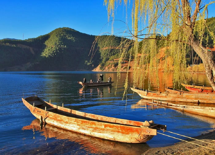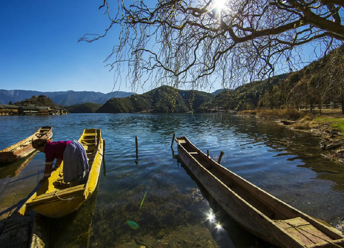 瀘沽湖與世隔絕。湖中的唯一交通工具是摩梭人獨(dú)特的“豬槽船”。最先記載“豬槽船”的文獻(xiàn)是清代道光《鹽源縣志》“夷民挎巨木中空,樺短以濟(jì),曰:豬槽船”。